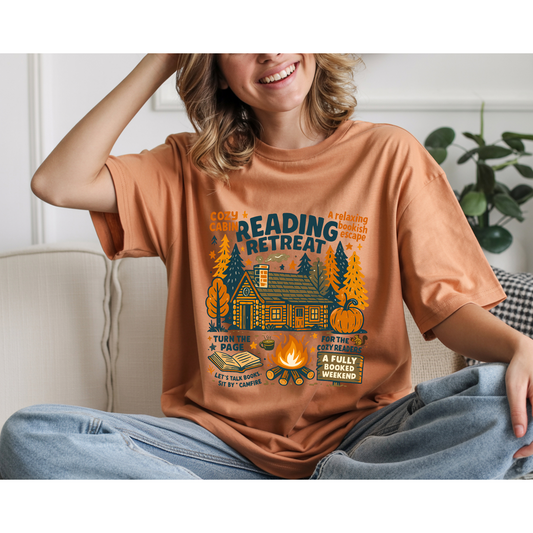 Cozy Reading Retreat T-Shirt - Maroon Color with Forest and Cabin Design for Relaxing Book Lovers