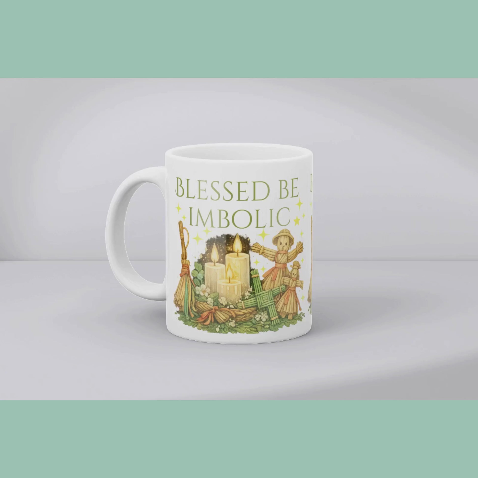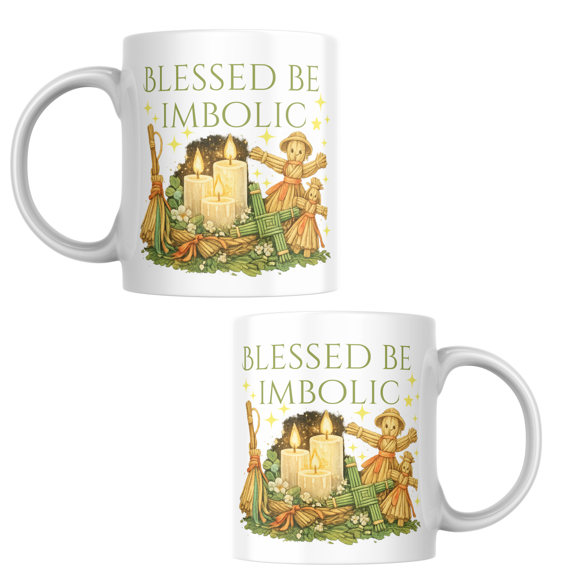 Welcome the season of light, renewal, and gentle warmth with this beautiful “Blessed Be Imbolic” mug. Featuring traditional Imbolic symbols—St. Brigid’s cross, corn dolls, white candles, fresh greenery, and a straw broom—this design honors the sacred turning of the Wheel with a soft, earthy palette and glowing golden accents.